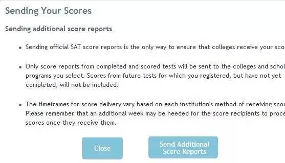 此时一定要注意,系统默认的是你选择寄送的所有分数All Scores,你需要根据申请学校的checklist中各所学校的送分政策来进行选分;如果该校送分政策是Highest Section(即可拼分),则一定要点击Choose Scores进行选分;选分页面如下图: