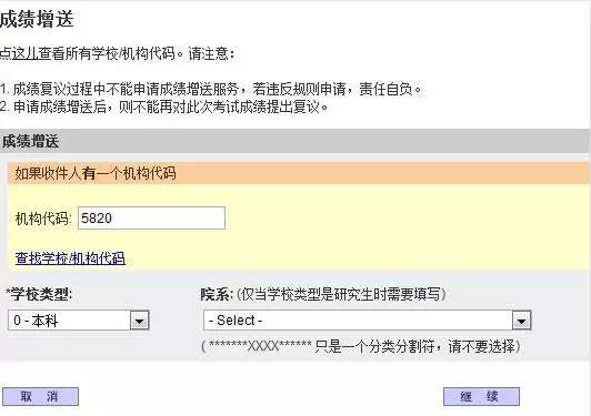在下一页面填写机构代码(通过查找的方式获取),在“学校类型”下拉框中选中“本科”,然后点击继续。