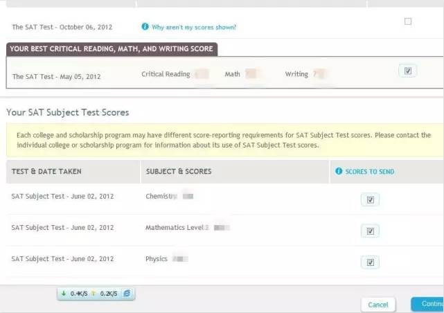选中你希望寄送的分数(SAT1和SAT2都可在同一页面选择)右边的复选框,勾出不希望寄送的分数,然后点击Continue;学校的送分政策是All Scores,也需要看清是否SAT2也需要寄送所有分数,如果SAT2需要选分,也需要进入这一页面。